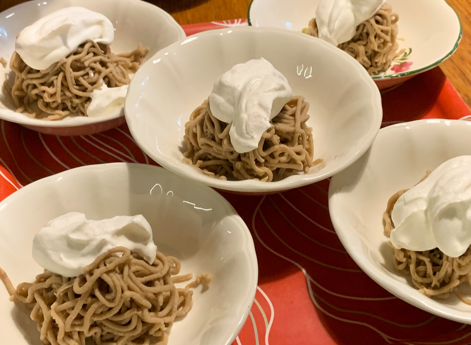 Another family favourite is vermicelles, a swiss dessert also known as Mont Blanc. The chestnuts are boiled, puréed, mixed with a bit of sugar, extruded with a special device and served with lashings of whipped cream.